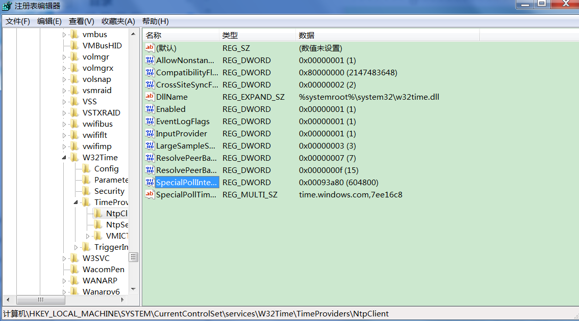2、 依次找到HKEY_LOCAL_MACHINE\SYSTEM\CurrentControlSet\Services\W32Time\TimeProviders\NtpClient