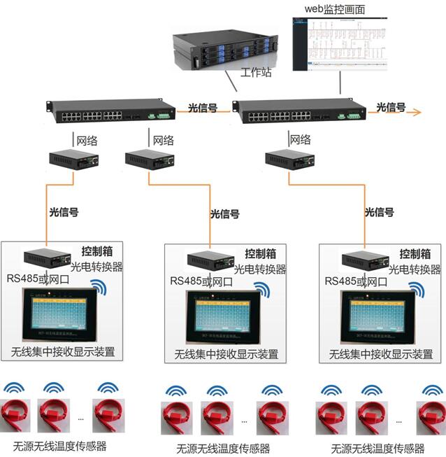 无线接收显示装置和光电转换器安装到控制箱内,每个配电室安装一套,用于接收显示本配电室电缆接头温度,具有两个独立上传接口RS485和RJ45网口,可通过标准modbusRTU和modbusTCP协议上传数据。